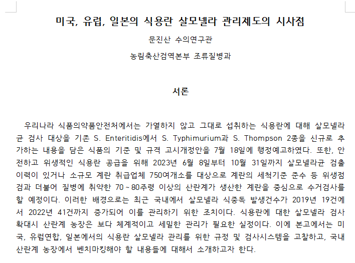 미국, 유럽, 일본의 식용란 살모넬라 관리제도의 시사점_ 문진산수의연구관